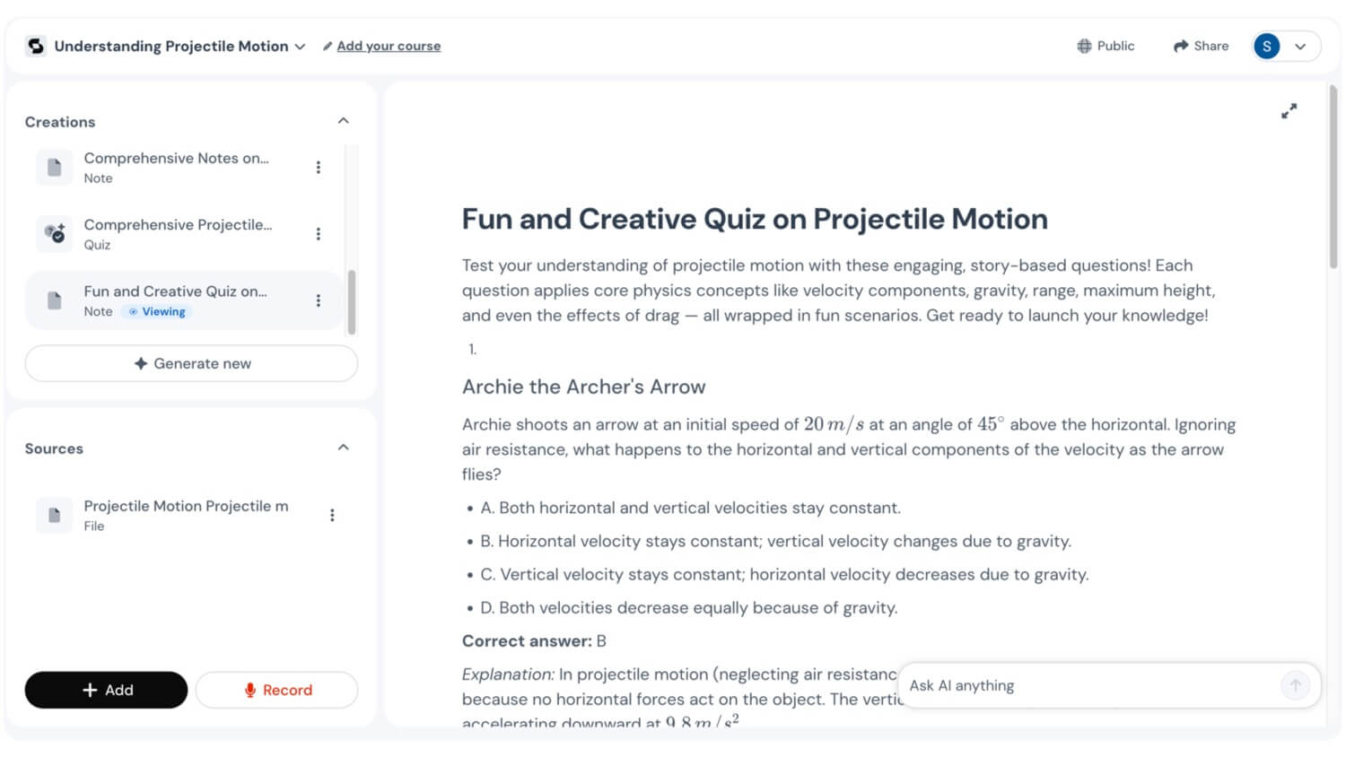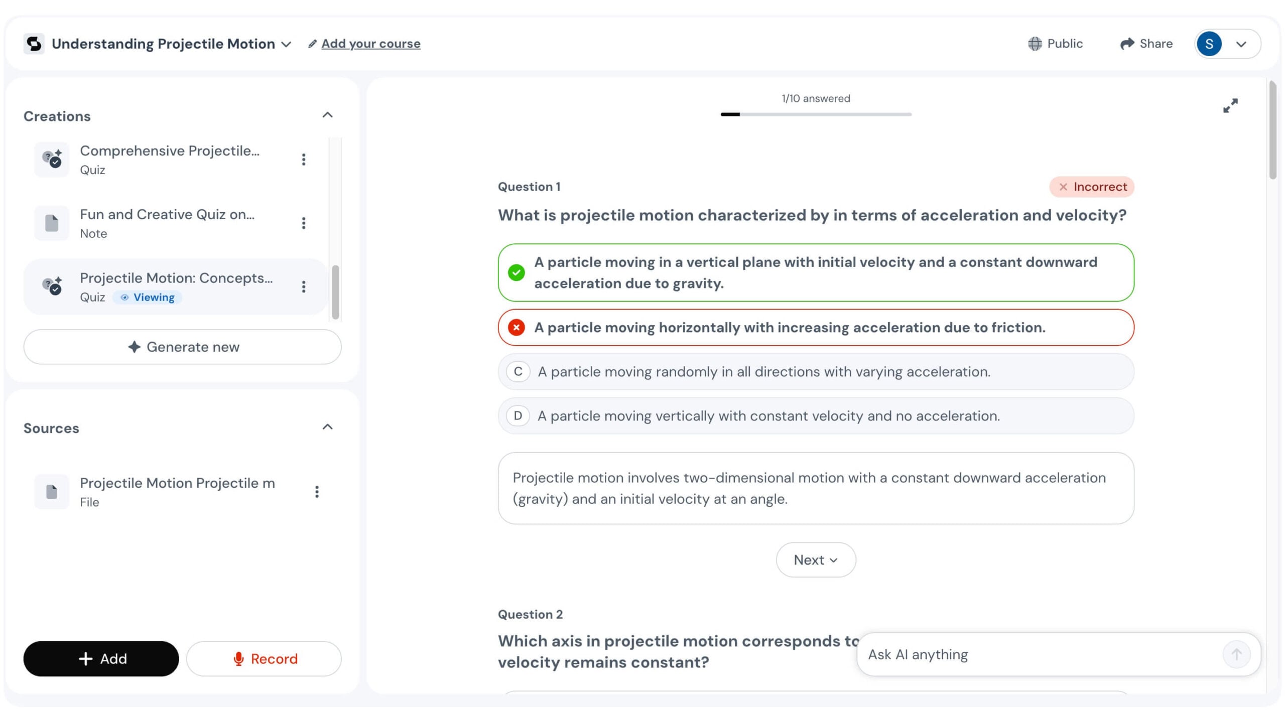 It generates an interactive quiz that offers quick feedback. Additionally, you can use Study Assistant to adjust the complexity and generate questions to help you understand better. And since it’s AI, you can also ask doubts, ask for help if you get stuck and also generate unlimited quizzes based on the content.