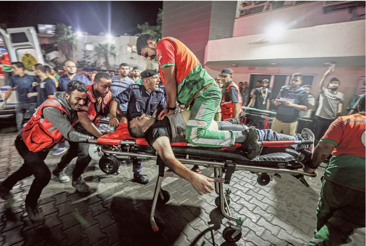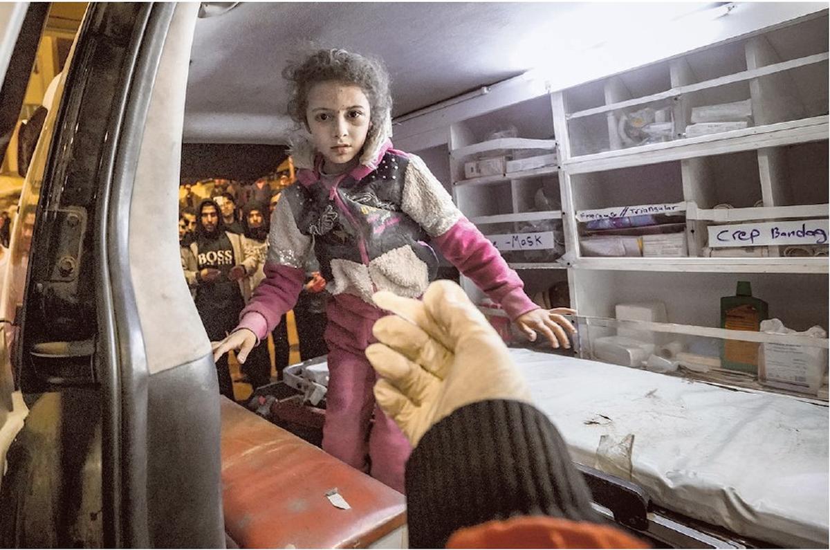 Fragile hope: A child rescued from a bombed building arrives at a hospital as emergency workers surround the ambulance